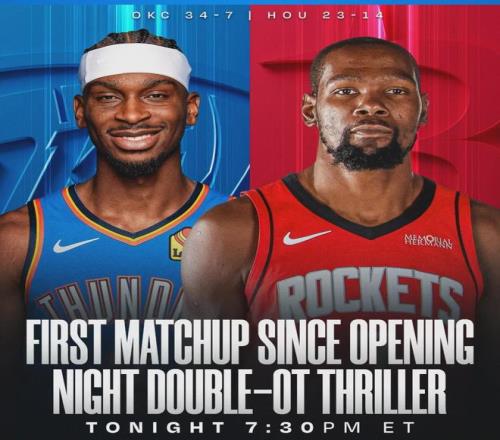 北京时间1月16日,NBA常规赛:火箭主场vs雷霆。截至今天赛前,火箭23胜14负排名西部第6,领先第7的太阳0.5个胜场。雷霆34胜7负依然高居联盟第一,领先东部榜首的活塞4.5个胜场,领先西部第二的掘金6个胜场。